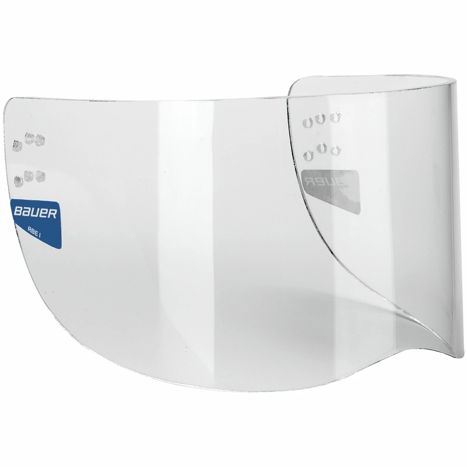 The Bauer ® RBE I Half Shield provides superior protection and a clear vision. This durable high-impact polycarbonate shield features a scratch resistant coating on each side. It also features side slots for a secure fit on your helmet.